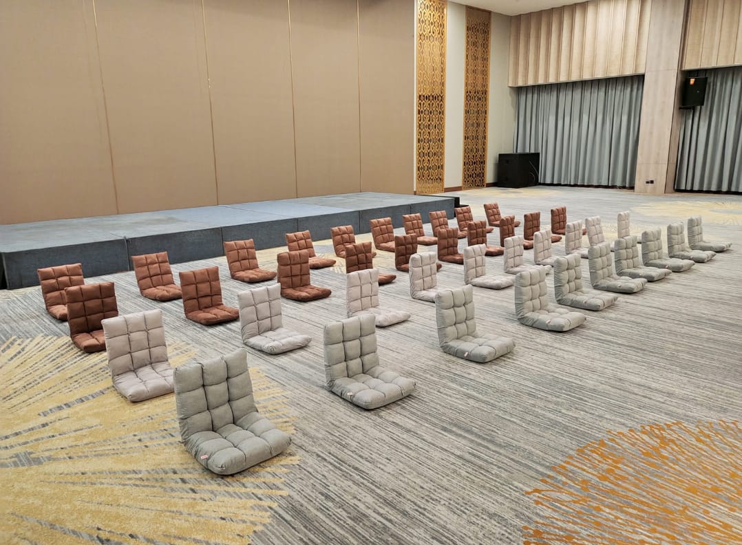 sofa lesehan mampu menciptakan suasana event yang lebih hangat dan akrab. oleh karena itu, banyak penyelenggara event memilih konsep lesehan untuk, event pengajian, arisan, workshop, seminar,event keagamaan, event ramadhan maupun event santai lainnya.